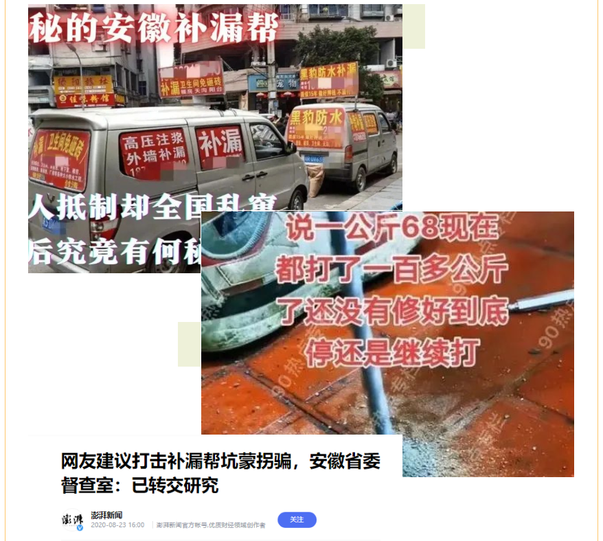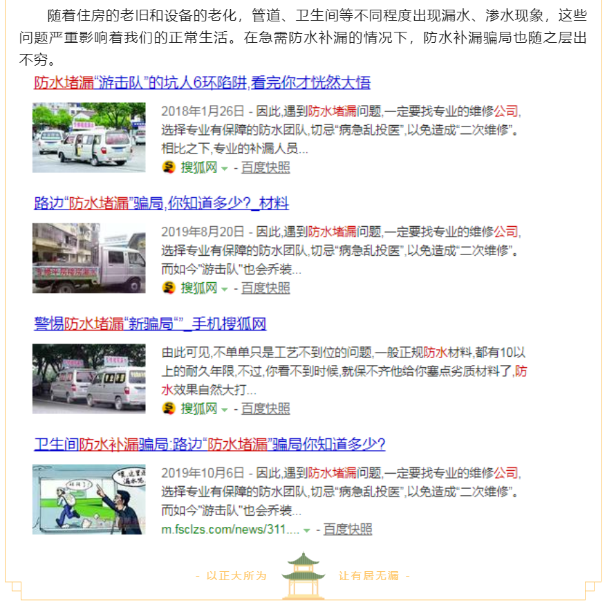 一是谨慎甄别网络信息。一般这类广告会充斥在各大互联网平台,基于我们主动搜索或者大数据广告推送,又因为自己家里漏水比较着急很容易被这类广告吸引。这类广告多为搜索广告和信息流广告。如果广告中带有上方所说的"高压注浆"类似的词语,大家一定要仔细甄别,不要轻信网络信息和小广告,联系防漏注胶业务时要仔细查询、查看对方是否经相关部门登记注册,谨防个别不法人员冒充专业公司技术人员行骗.